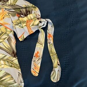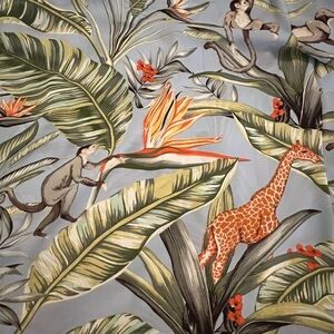 Vibrant fabric featuring a tropical monkey and giraffe design. Includes shades of green, orange, and gray. Fabric hanging from short sleeves. XS but runs larger (prob like a small)