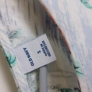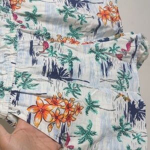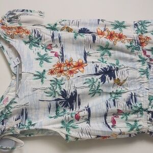 So cute!! Tropical Beach motif in a linen, cotton and viscose fabric! Elastic waistband, 2 side pockets, button keyhole closure in back with crisscross fabric and gathered tied shoulders.