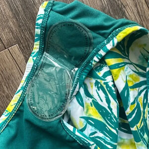 Color/Pattern: Vibrant green, yellow, and white palm leaf print with solid green lining.