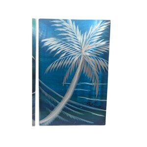 This set of two metal wall art pieces features tranquil palm tree designs, signed by the artist. Ideal for adding a touch of tropical elegance to any space.