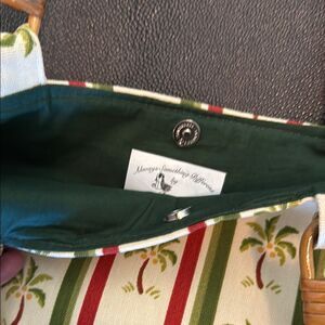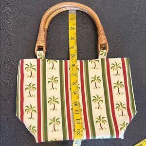 This stylish tote bag features a vibrant tropical palm print in green and red stripes. The bamboo handles add a touch of natural elegance. Perfect for a day out or a casual outing.