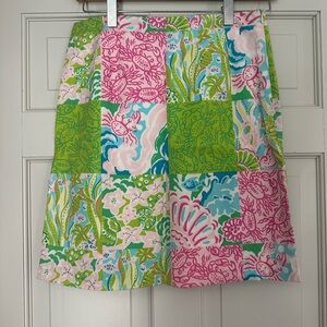Brighten your look with this tropical patchwork mini skirt. Featuring vibrant green, pink, and blue hues, it's perfect for a fun and lively style.