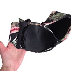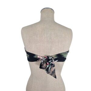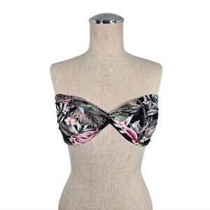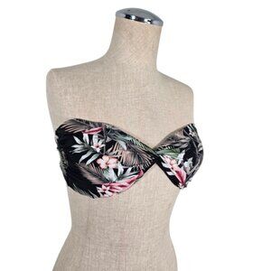 Strapless bandeau bikini top with a vibrant tropical print on a black base. Features a twisted front detail, molded cups, and sweetheart neckline for a flattering fit. Ideal for the pool or beach.