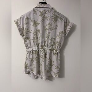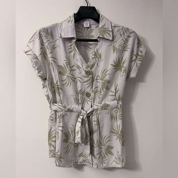 Stylish blouse with a tropical leaf print. Features button-up front and waist tie.