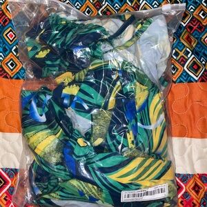 Vibrant tropical print with green, yellow, and blue colors. Perfect for a bold look.
