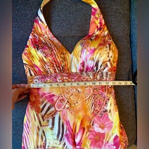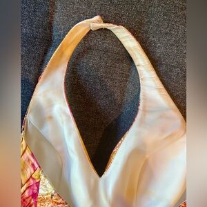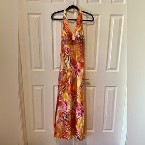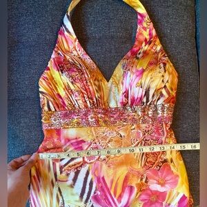 Tropical Print Floor Length Orange Yellow Pink Halter Prom Dress Gown