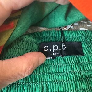 Vibrant tropical print halter top featuring a mix of green, orange, and red hues. Perfect for adding a splash of color to your wardrobe.