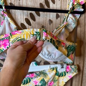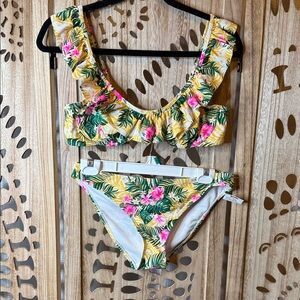 Dive into summer with this vibrant tropical print bikini set. Featuring a playful ruffle design, this bikini combines style and comfort. Perfect for beach days and poolside lounging.