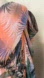 Vibrant tropical print sheer top. Features orange, green, and blue hues.