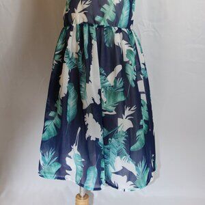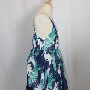 Tropical print lightweight sundress featuring a tropical leaf print in shades of green and white on navy blue background. Spaghetti straps with rounded neckline and empire gathered waist.