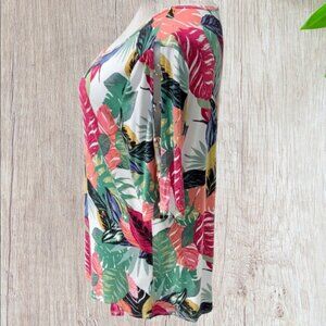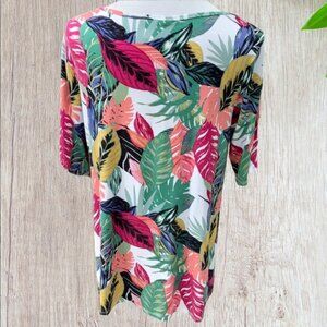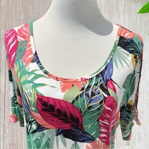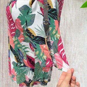Wide scoopneck and short sleeves, with a slit down the middle and held together with small goldtone rings.