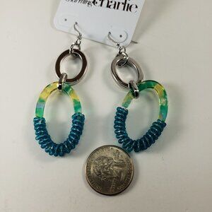 These multicolor drop-dangle earrings are the perfect addition to any fashion-forward wardrobe. Featuring a stunning silver-tone and dangling hoops, they offer a trendy and eye-catching look. These earrings are designed to complement a variety of styles and outfits, making them a versatile and essential accessory. New With Tag.