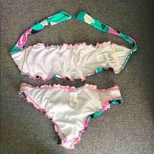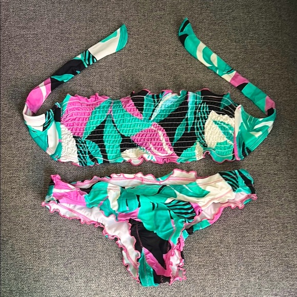 Vibrant bikini set with tropical print. Features bandeau top and matching bottoms. No defects and very lightly worn.