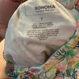 Vibrant ruffle skirt with a tropical leaf pattern. Features shades of green, blue, pink, and yellow.