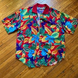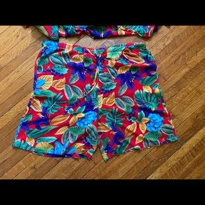 This set is super cute and colorful! It’s true vintage and in great loved condition. It says size medium but fits more like a large. The shorts have a string waistband so they’re adjustable. Branded for exposure.