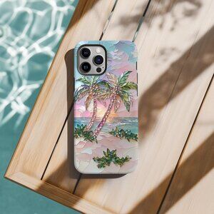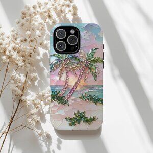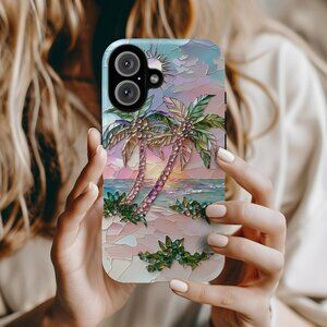 Enhance your phone with this stylish pink blue purple green beige luxe glam tropical beach ocean waves palm tree sand summer sunrise sunset sun ray sky iridescent opalescent pearlescent trendy luxury tropical faux stained glass design IPhone 16, 15, 14, 13, 12, 11, 8, X, XR, XS, XS Max (Pro Max, Pro, Plus, Mini) case. Perfect for adding a touch of elegance to your device.