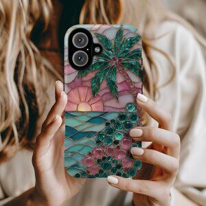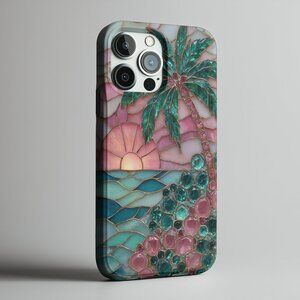 Enhance your phone with this stylish pink blue teal green luxe glam faux gem tropical beach ocean waves palm tree sand summer sunrise sunset sun ray sky iridescent opalescent pearlescent trendy luxury tropical faux stained glass crystal rhinestone design IPhone 16, 15, 14, 13, 12, 11, 8, X, XR, XS, XS Max (Pro Max, Pro, Plus, Mini) case. Perfect for adding a touch of elegance to your device.