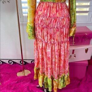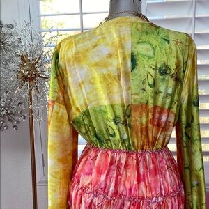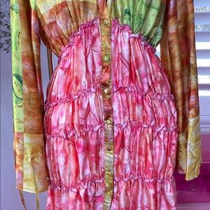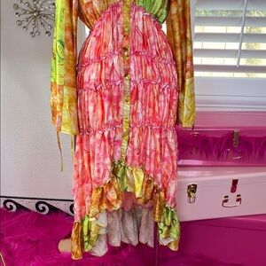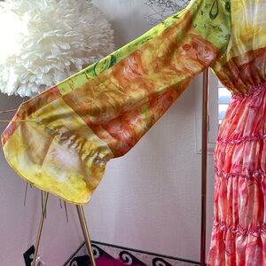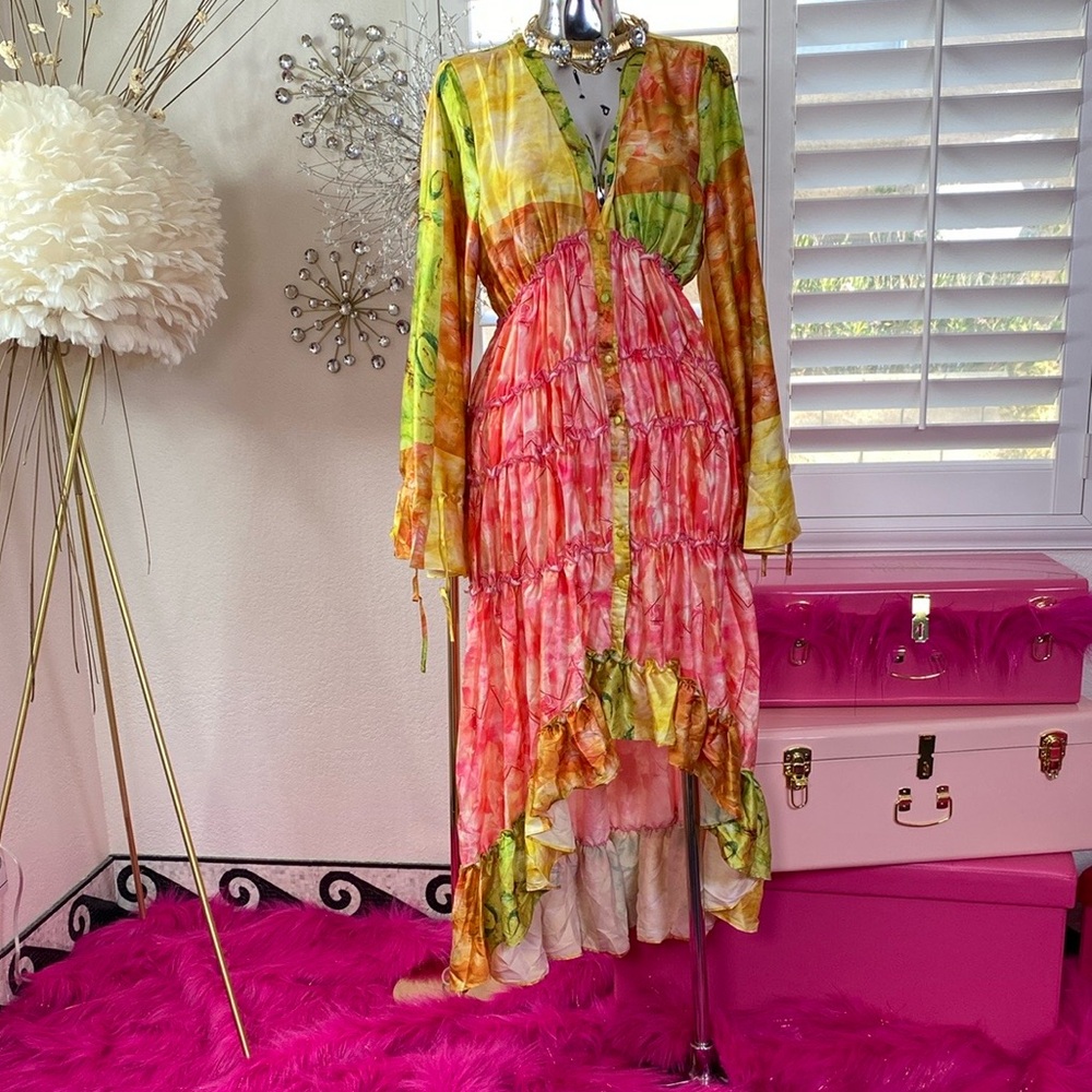 Turn heads in this high-low maxi dress bursting in tropical sunset hues—coral pink, citrus orange, and lemon-lime swirls. The voluminous tiered bodice cinches at the waist with ruched gathers that flatter every curve. Dramatic bell sleeves and contrast ruffle trim add luxe dimension, while the front snap buttons offer easy styling versatility. Fabric flows with every step, giving goddess vibes from brunch to vacation runway.