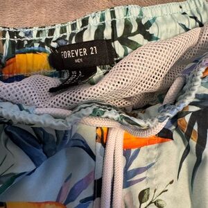 Vibrant swim shorts featuring a tropical toucan and pineapple print. Perfect for a beach day.