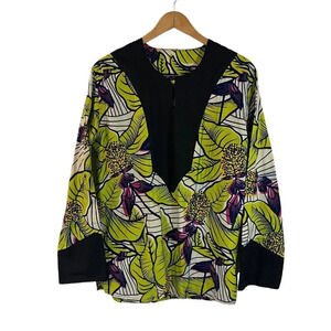 Elevate your summer and spring wardrobe with this colorful tropical tunic blouse. The blouse features a beautiful floral pattern in bright shades of green and yellow that will surely turn heads. The round neck and long sleeves provide a casual feel, while the pullover closure ensures comfort and ease of wear.