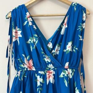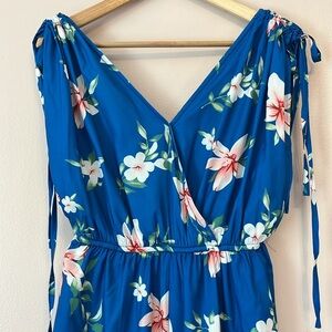 Super cute and silky sleeveless romper in a tropical blue and pink floral print. Unbranded (suspect it’s an Amazon brand), size small. Perfect for summer. V neck with a V in back. Ties at the top of each shoulder for a cute feminine detail. Pockets!! Elastic waist. Very comfy.