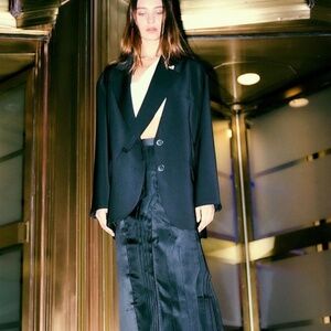 Crafted from luxurious recycled tropical wool, this intentionally oversized blazer is a riff on the classic Tibi Liam blazer with a detachable lapel. In classic black twill.