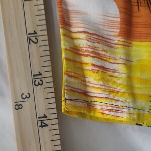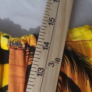 Vibrant yellow and orange shorts with a tropical palm trees and sunset design. Perfect for a beach day.