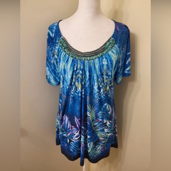 This is gently used blouse. It is multiple colors and tropical floral style designs. It is a silky tunic style blouse. It has beads on the neckline shown in pictures. It is short sleeves 💙See last picture for more details 💙
