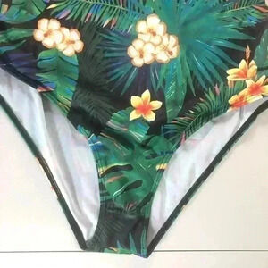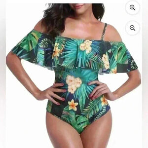 New with tags Tropical floral print one piece swimsuit off shoulder ruffle cut out back size Large.