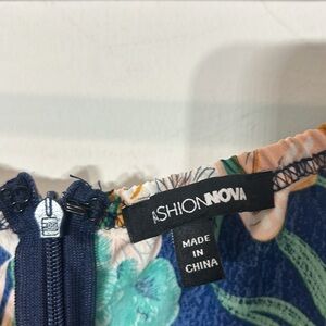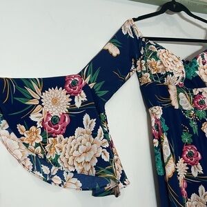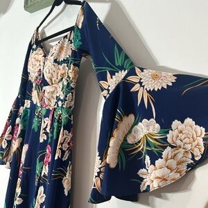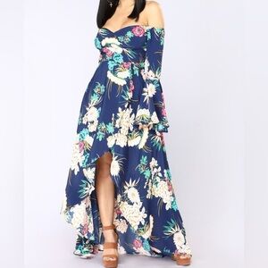Tropical high low maxi off the shoulder dress with statement sleeves blue floral