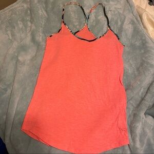 Hot coral-y pink with tropical palm print trim racerback spaghetti strap tank top