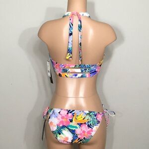 Beautiful tropical Hawaiian print with hibiscus flowers and palm leaves. Fully lined. Soft removable cups. The bottoms tie on the sides. The bottoms are string bikini bottoms like the ones on the manikin. I love this suit! It is so cheerful.