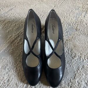 Trotters Black Leather Jaimie criss cross black heels shoes Maryjane style low heels almond toe