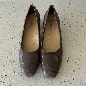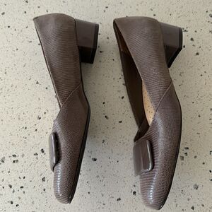 Trotters Delse Taupe Lizard Print Suede Leather Pumps Low Block Heel Women’s 8 NARROW