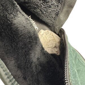 Keywords: Trotters suede booties, green faux fur moccasins, women’s side zip bootie slippers, cozy suede ankle boots, warm lined moccasin shoes, comfy slip-on booties, size 10