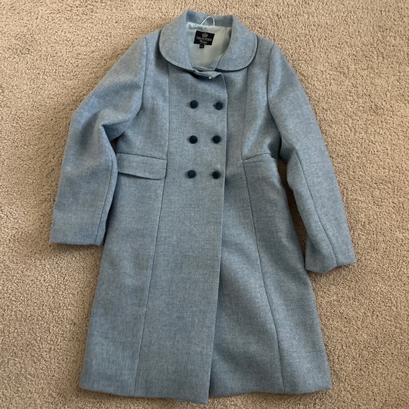 Beautiful pea coat made of 100% wool! Features a gorgeous Peter Pan collar and navy blue details that make this coat simply elegant. Great addition to a winter wardrobe!