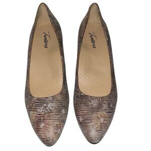 Chic and comfortable, these Trotters kitten heel pumps feature a unique multicolor abstract stripe pattern that adds subtle flair to any outfit. The soft pointed toe and low-profile heel make them perfect for work, special events, or everyday elegance. Designed with a cushioned insole for added comfort, these shoes are a great blend of fashion and function.