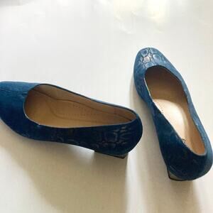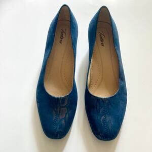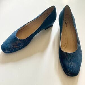Trotters brand. Size women's 11.5 medium. Pattern is a shimmery blue snakeskin / animal print; round closed toe; block heel. In preloved condition, some wear on the bottom of the soles, very minor white scuffs in the blue material (see photos for condition). Leather upper; sole is made of man-made materials. From a pet friendly home.