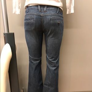 98/2 cotton spandex low rise jeans. Trouser cut with slash front pockets and back welt pockets. Pocket bags cut from orange fabric. Waist 35", inseam 31 1/2", fr. rise 8", bck rise 13 1/2", 1/2 leg opening 10". Excellent condition