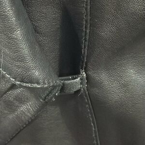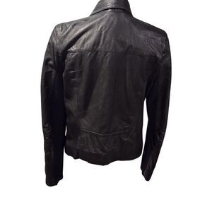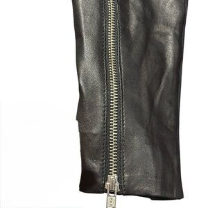 Description: leather moto style jacket with hook and eye closure and zippered sleeves
