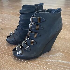 Leather wedge peep toe bootie with buckle details up the front. Buckles are functional. Side zip for easy on off.