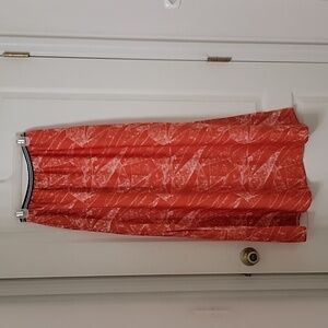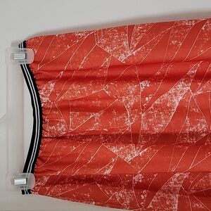 Trouve Size S Orange White Maxi Skirt, High Side Slits, Contrast Waistband. Excellent, Like New Condition. Black white stripe elastic waistband, Orange and White "Marbled" look pattern. Unlined. 100% Polyester. Looks great with heels, sandals or sneakers! Please refer to measurements in photos to ensure proper fit.