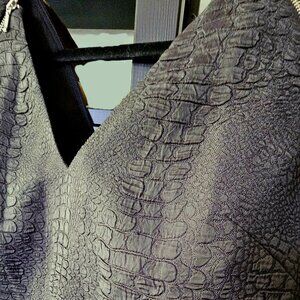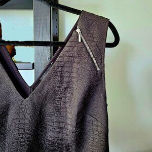 NWOT textured top blouse with 2 accent zippers on the front of the blouse. The top is fitted, the v-neck and zippers giving it interesting details, and can be layered over a thin see-through or mesh top. The front is textured to mimic reptile skin, so it automatically adds visual interest when worn with something simple!