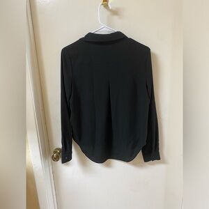 Chic black button-down shirt. Features classic collar and front pocket. Ideal for versatile styling.