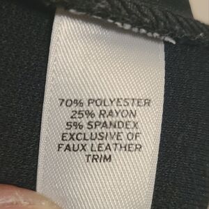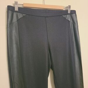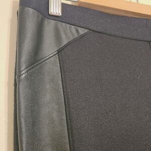 Sleek black leggings with faux leather panels by Trouve, size large. Perfect for a chic look. Comfortable and stylish. Fabric blend of polyester, spandex, and rayon. Excellent pre-owned condition; no flaws.