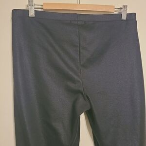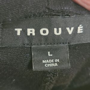 Sleek black leggings with faux leather panels by Trouve, size large. Perfect for a chic look. Comfortable and stylish. Fabric blend of polyester, spandex, and rayon. Excellent pre-owned condition; no flaws.