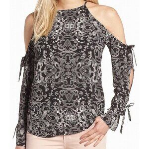 Trouve black graphic printed tied cold shoulder long sleeve blouse small MSRP 69