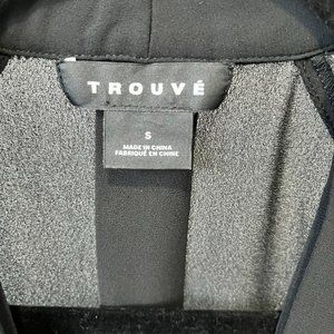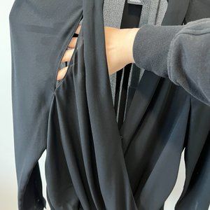 Trouve long sleeve sheer blouse in black. Beautiful cross-over style with cut-out details along neckline. Can be dressed up or down, great for going out. Size small.
