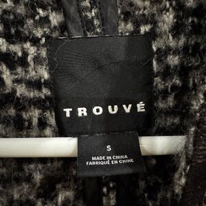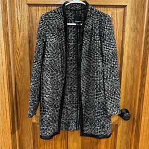 Trouve long open boucle cardigan with faux leather trim. Wool blend. Gray, black & white textured coatigan. Size small