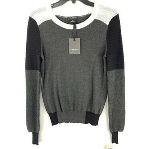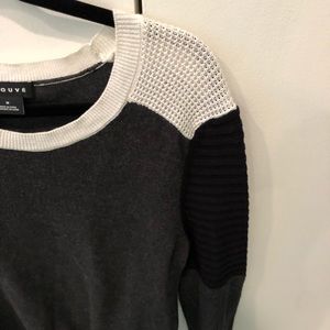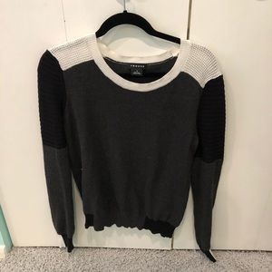 Gray sweater. Trouve. White waffle material on shoulders. Black design on arms. Long sleeve. Crew neck.